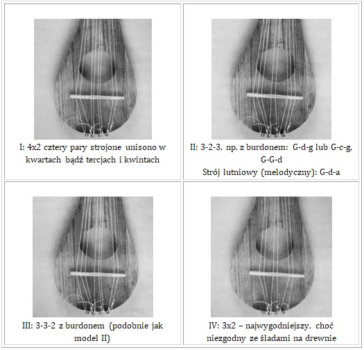 Ilość strun w naciągu gittern była różna, co więcej mogły występować warianty jedno- i dwuchórowe. Najczęściej spotykana była odmiana 3-strunowa. Obecność ośmiu kołków tutaj najpewniej świadczy o takiej właśnie ilości strun (8), co zdają się potwierdzać ślady wgłębień po strunach zachowane na powierzchni drewna – na prożku i podstawku. Struny wiązano po dwie na każdym z czterech guzików płużkowych – pod ich naciskiem powstały cztery grupy wgłębień na krawędzi płyty wierzchniej. Struny naciągane między kołkami a podstawkiem osiągały długość między 30- 32/33 cm i wykonywane były prawdopodobnie z jelita.