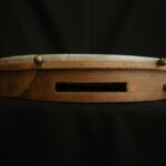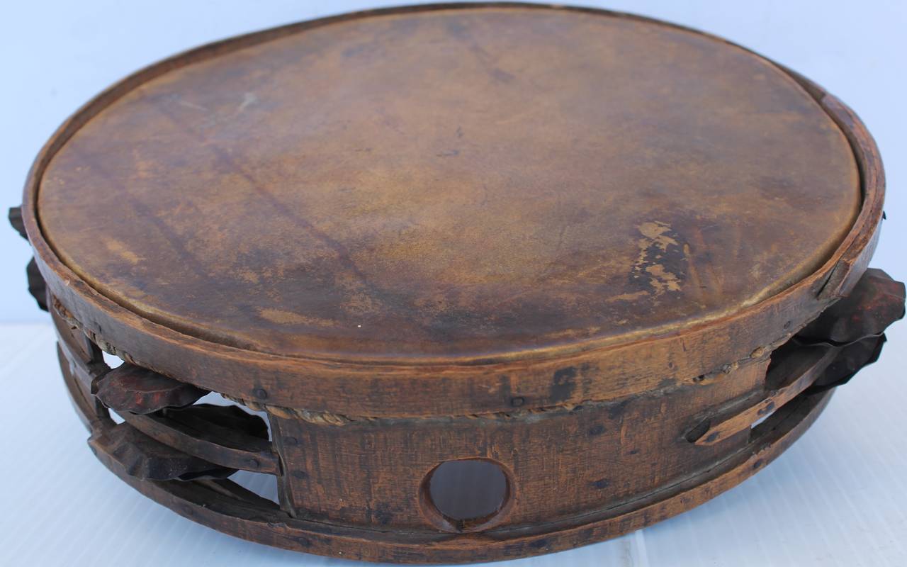 Porównanie bębnów ludowych z polskich muzeów z ikonografią wczesnonowożytną zmusiło mnie do odrzucenia regulacji naciągu – jest to chyba podstawowa cecha wczesnonowożytnego ludowego bębenka, którą mogłam wywnioskować z malarstwa. Regulacja naciągu w polskich bębnach jednomembranowych z brzękadłami wydaje się być zresztą dość oryginalnym rozwiązaniem w porównaniu do panujących standardów w zachodnio- i południowoeuropejskiej kulturze ludowej. Na południu membrana zwykle jest przyklejona lub przybita nitami, jednak postanowiłam zaczerpnąć rozwiązanie z kręgu anglosaskiego. Oto wynaleziony na aukcji bębenek z Nowej Anglii. Membrana przymocowana jest tutaj dodatkowo przybitą listwą.