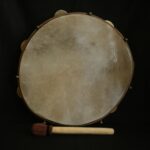 Konstrukcja to jedno. Druga sprawa to estetyka. Przyglądając się różnym obiektom muzealnym – czy to etnograficznym, czy archeologicznym – łatwo zauważyć, że instrumenty ludowych grajków wykonywane są zwykle niedokładnie, widać ślady ręcznej obróbki, napraw, czy intensywnego użytkowania. Dlatego postanowiłam nie starać się zbytnio. Niedoskonałość bębna miała stać się tutaj atutem, próbą nadania autentyczności. Z jednej strony ze względów wizualnych (na potrzeby imprez rekonstrukcyjnych), z drugiej jako mały eksperyment akustyczny. Brzękadła są więc zwykłymi krążkami wyciętymi z blachy miedzianej, zamontowane na takich też drucikach. Dodatkowo bęben wzbogaciłam estetycznie i dźwiękowo o dzwonki z blachy brązowej. Listwę przybiłam gwoździkami mosiężnymi. Żadnych współczesnych stali czy aluminium! Łatwo też zwrócić uwagę na brak symetrii obręczy, co częste jest w amatorskich bębnach ludowych na całym świecie.