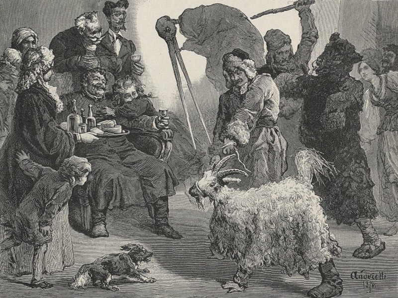 M. Andriolli. Wieśniaczy obrzęd „wodzenie kozy” przed polskim szlachcicem. Zachodnia Białoruś, XIX w. (domena publiczna)