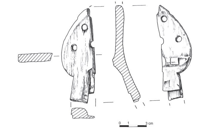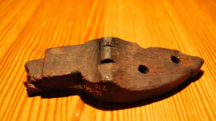 Fragment główki instrumentu strunowego o sercowatym kształcie najprawdopodobniej stanowi pozostałość po rebeku – średniowiecznym chordofonie smyczkowym. Znaleziony został na śmietnisku zlokalizowanym przy jednym z mostów prowadzących na wyspę Ostrów Lednicki. Trafił tam zapewne po tym, jak instrument został zniszczony.