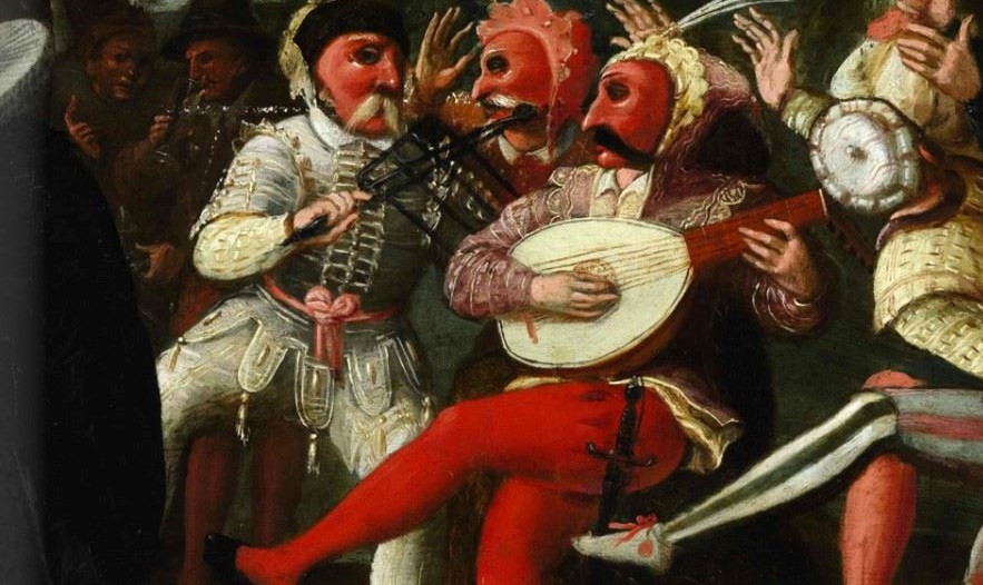 Istnieje związek pomiędzy czasem akcji rymowanki – okolicy świąt Bożego Narodzenia, a umieszczeniem w rękach muzyków nie instrumentów, lecz naczyń. Szczególnie charakterystyczny jest ruszt w rękach lutnisty. Motyw muzyka grającego na ruszcie tak, jakby to był instrument strunowy, często przewija się w sztuce (szczególnie niderlandzkiej) i zwykle nawiązuje do tradycji kolędniczej. Kolędnicy bowiem obchodzili wsie i miasta czyniąc raban, co wiązało się z dawnymi zwyczajami mającymi na celu wypędzenie sił demonicznych. Według wierzeń ludu różne duchy nawiedzały domostwa w okresach szczególnych w kalendarzu dorocznym, takich jak przesilenia (pisałam o tym m.in. w artykule Czy to jeszcze muzyka? O diabelskich dźwiękach burczących garnków i beczek). Tego rodzaju praktyki przetrwały w kulturze ludowej bardzo długo, na Kaszubach objawiając się w użyciu takich instrumentów jak burczybas, czy diabelskie skrzypce. W sztuce przedstawienie narzędzi kuchennych występujących w roli instrumentów stało się również sposobem na symboliczne ukazanie chaosu i nieuporządkowania. Tego motywu użył też inny gdański malarz, Herman Han, który wyobraził w ten sposób komedianta parodiującego skrzypka na obrazie Alegoria cnoty małżeńskiej.