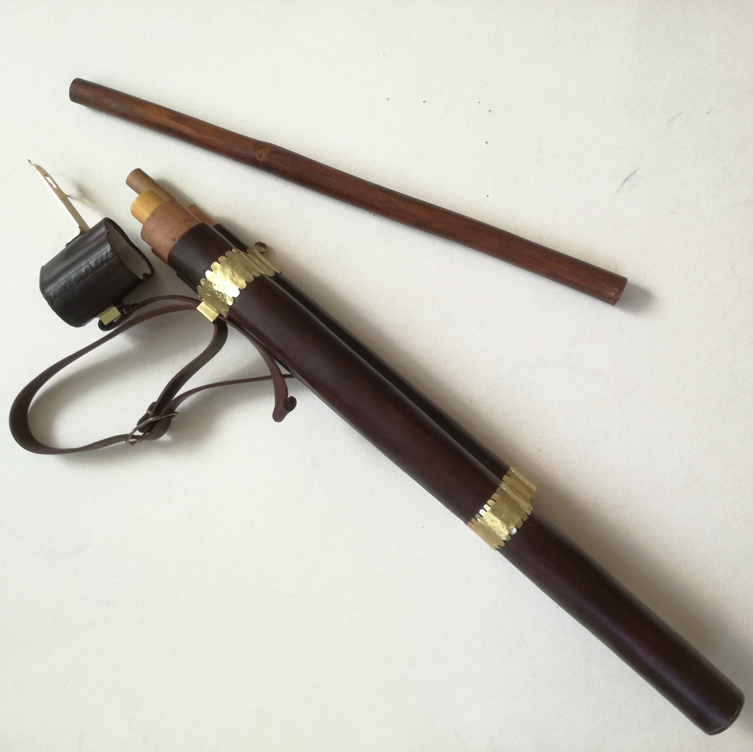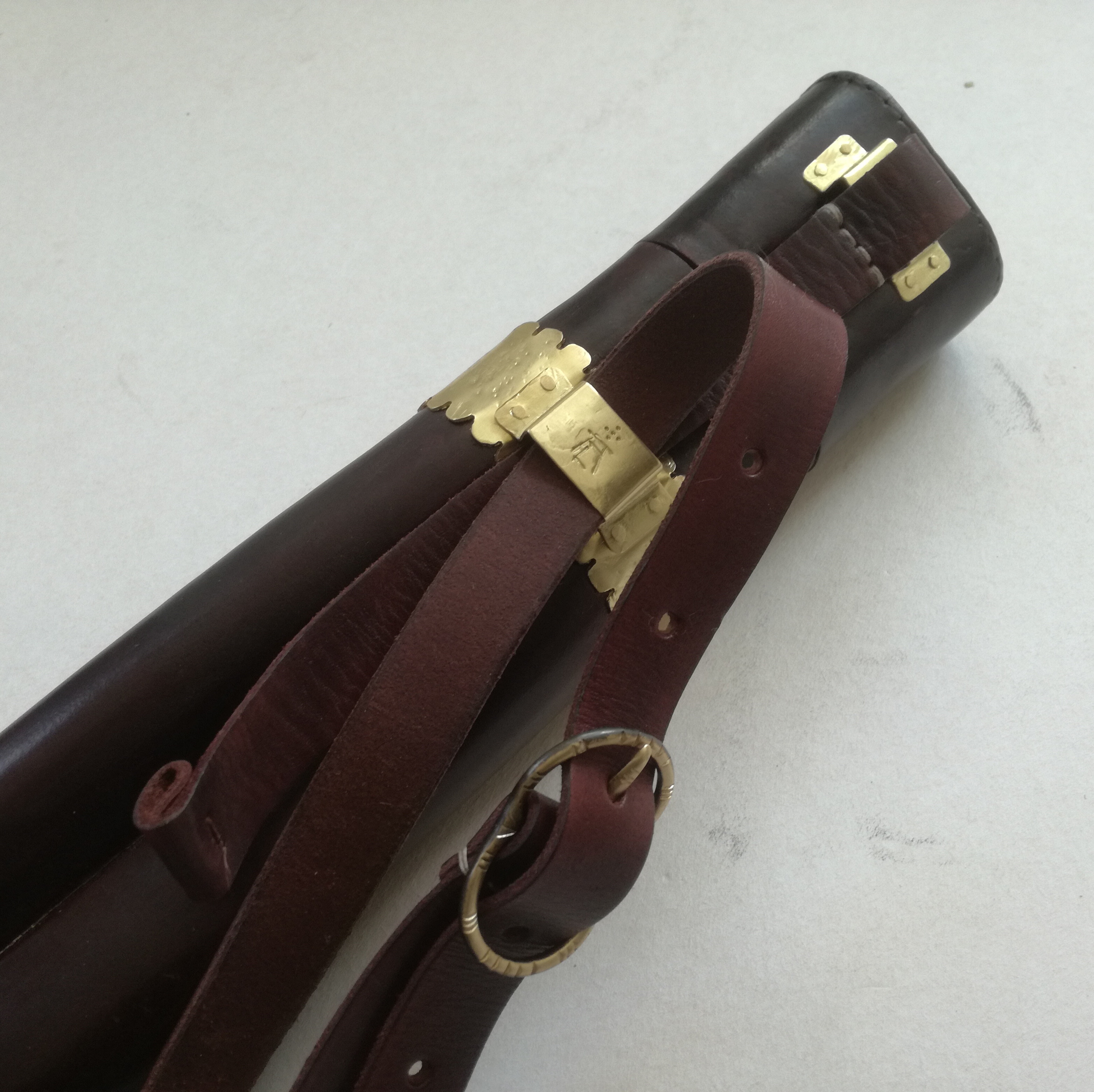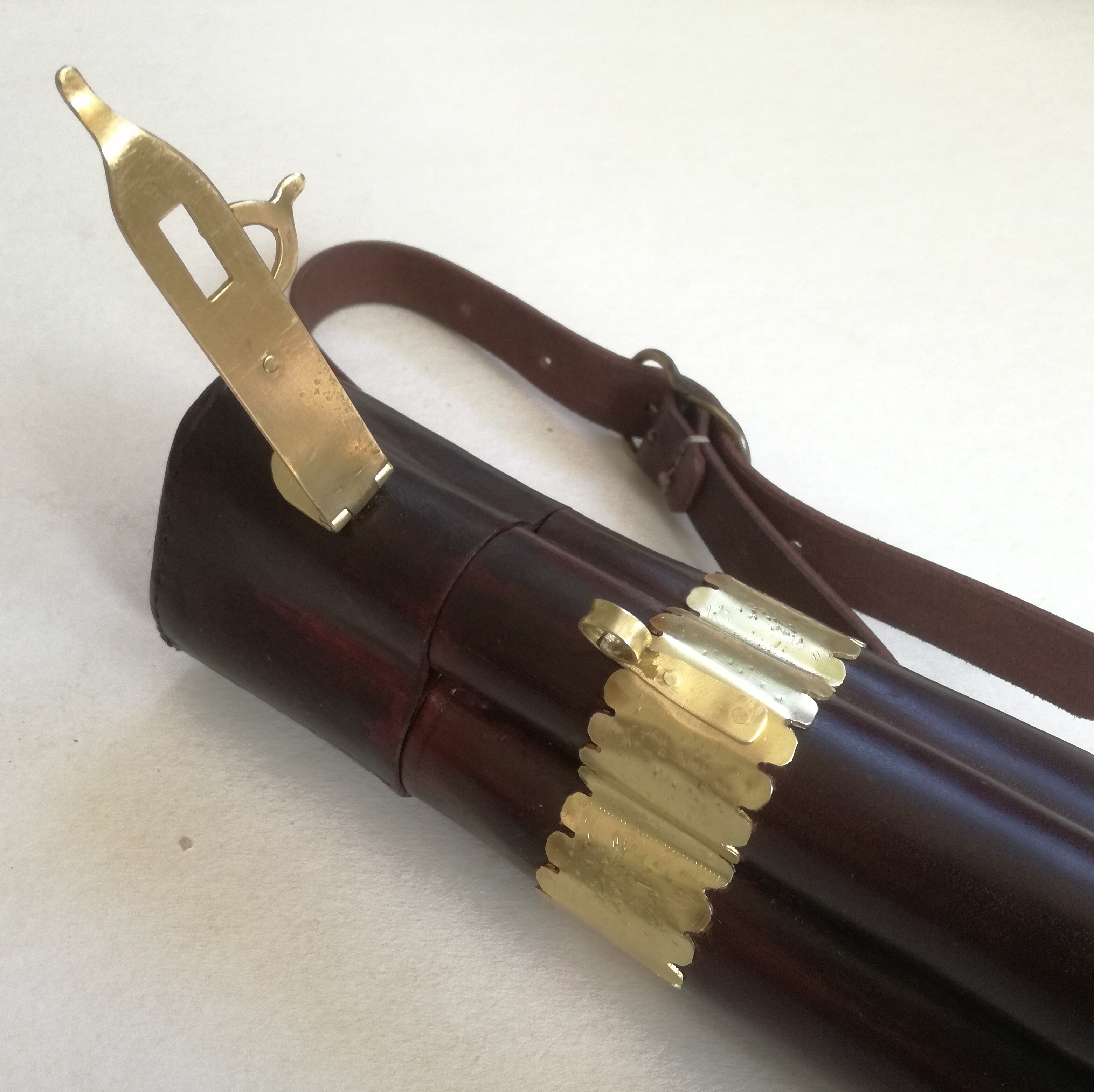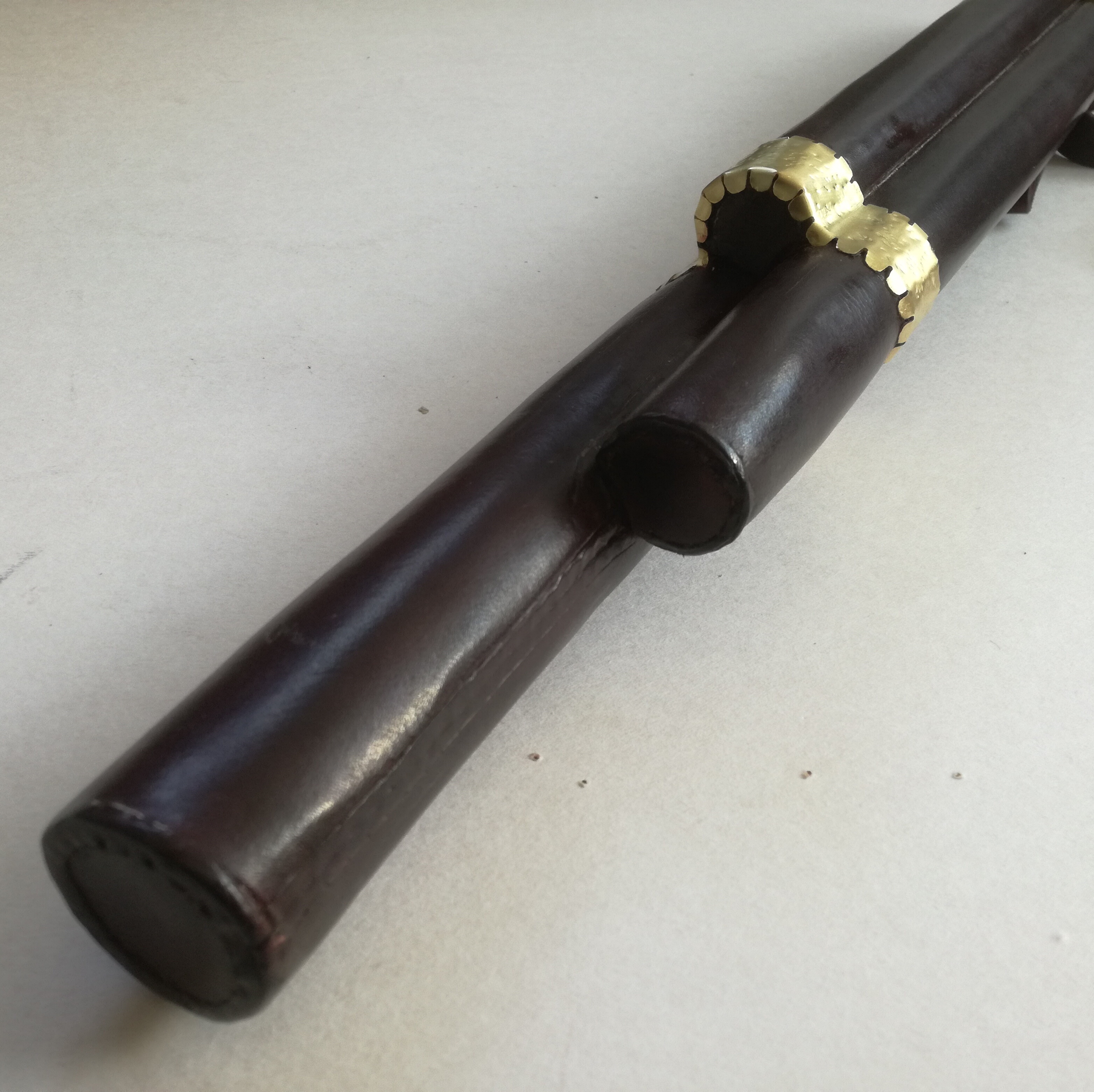 „Futerał składa się z trzech skórzanych rur, połączonych w jedną wiązkę i owiniętą w kolejną warstwę formowanej skóry. Ta z kolei jest okuta dwiema mosiężnymi obejmami, stabilizującymi całość oraz pozwalającymi na podwieszenie futerału do pasa. Skóra była formowana na mokro, na modelach fletów, nasączona klejem kostnym. Dekielek jest wykonany z formowanej i utwardzanej skóry, mocowany rzemieniem do okucia korpusu, wyposażony w zameczek z hakiem pozwalającym na zamknięcie całości i uniknięcie przypadkowego otwarcia. Zamknięcie to wzorowałem na zabytku futerału z Kunsthistorisches Museum w Wiedniu.”